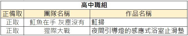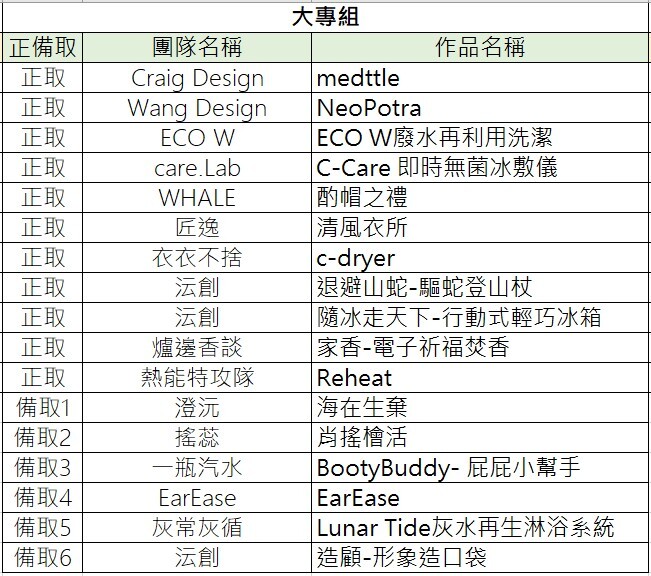 本競賽之「正取隊伍」即為最終得獎隊伍,惟實際獲獎等級(如金、銀、銅、佳作)將於頒獎典禮當日現場公布,以下非以名次排序。